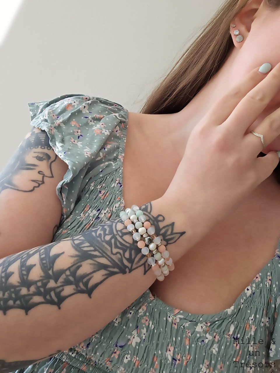 Composé de pierres semi-précieuses d'Amazonite, d'Agate et de Jade ainsi que de perles d'eau douce, de cristal et d'acier inoxydable.