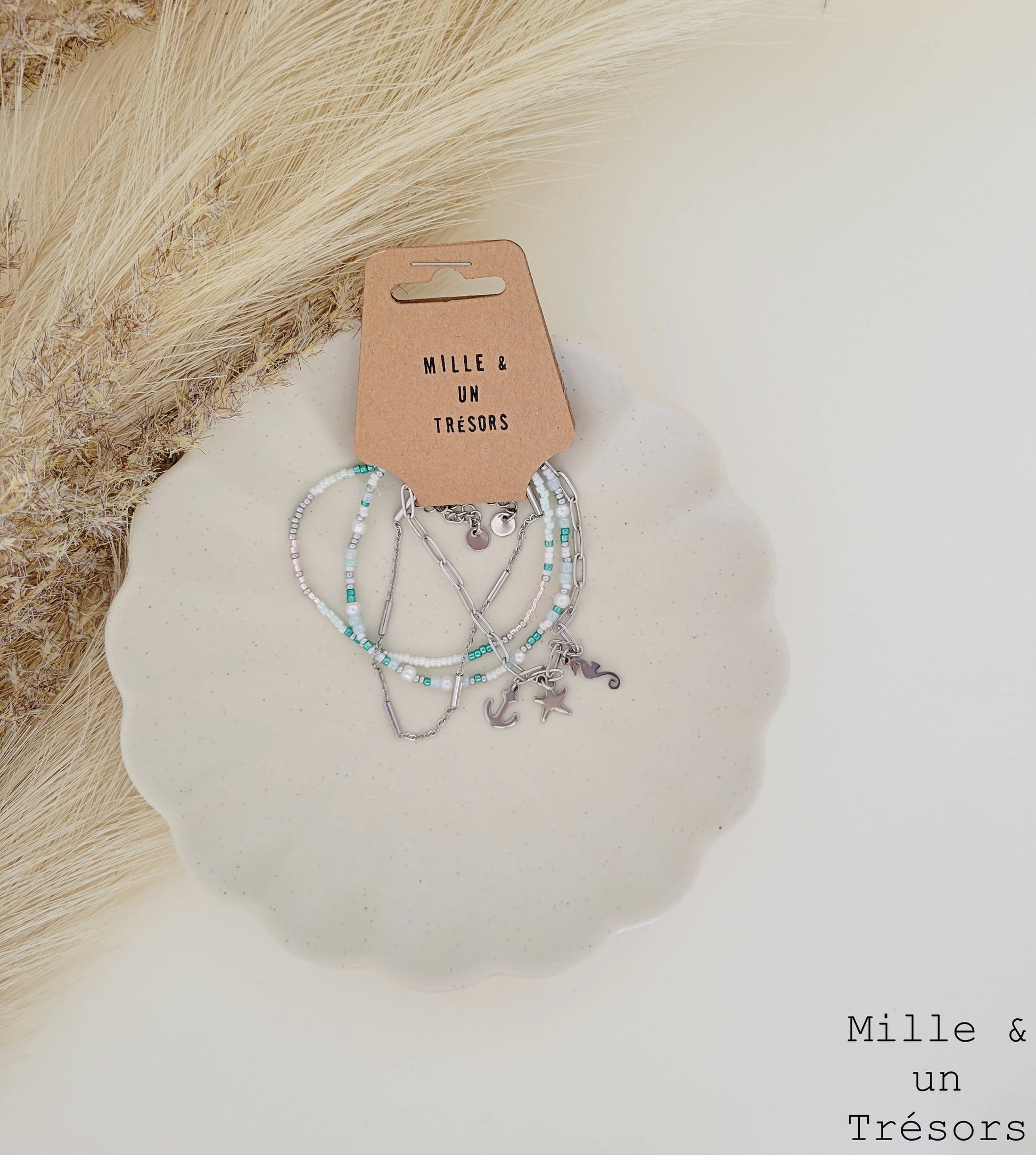 Ensemble de 4 bracelets composés de chaînes en acier inoxydable, de rocaille chinoise et de perles de verre.