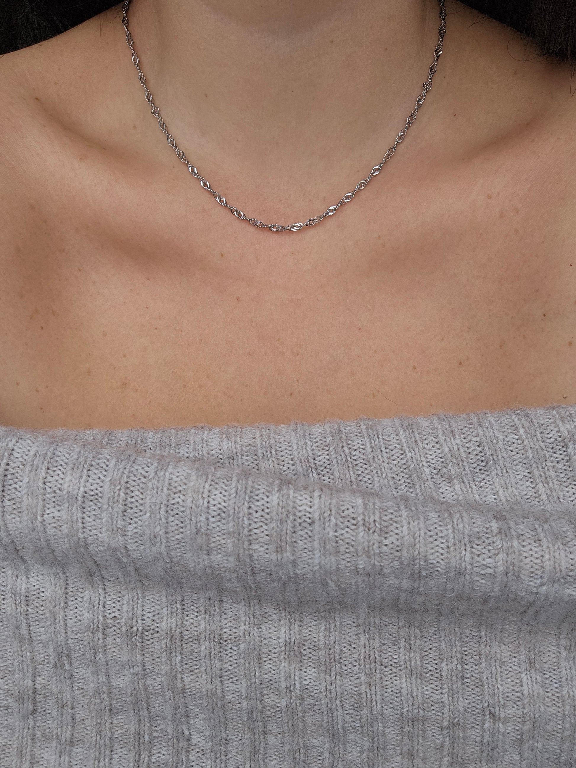 Lumière discrète. Le collier Arya est simple et léger. Sa couleur argentée capte doucement la lumière et accompagne tous les moments du quotidien. Un bijou facile à porter qui apporte un éclat doux et subtil à votre look.
